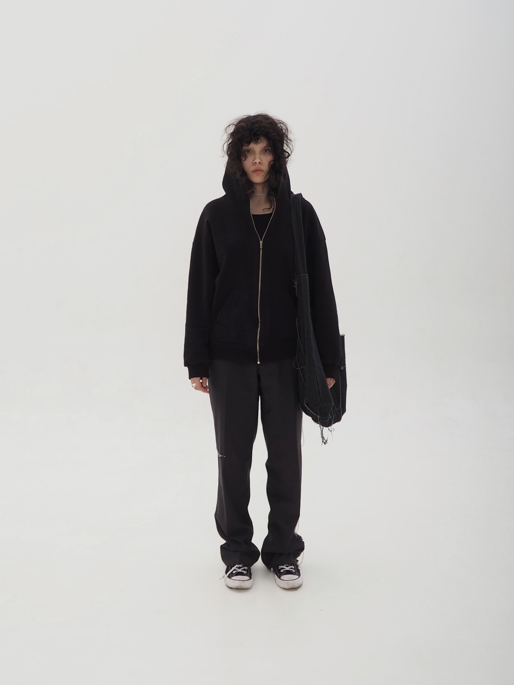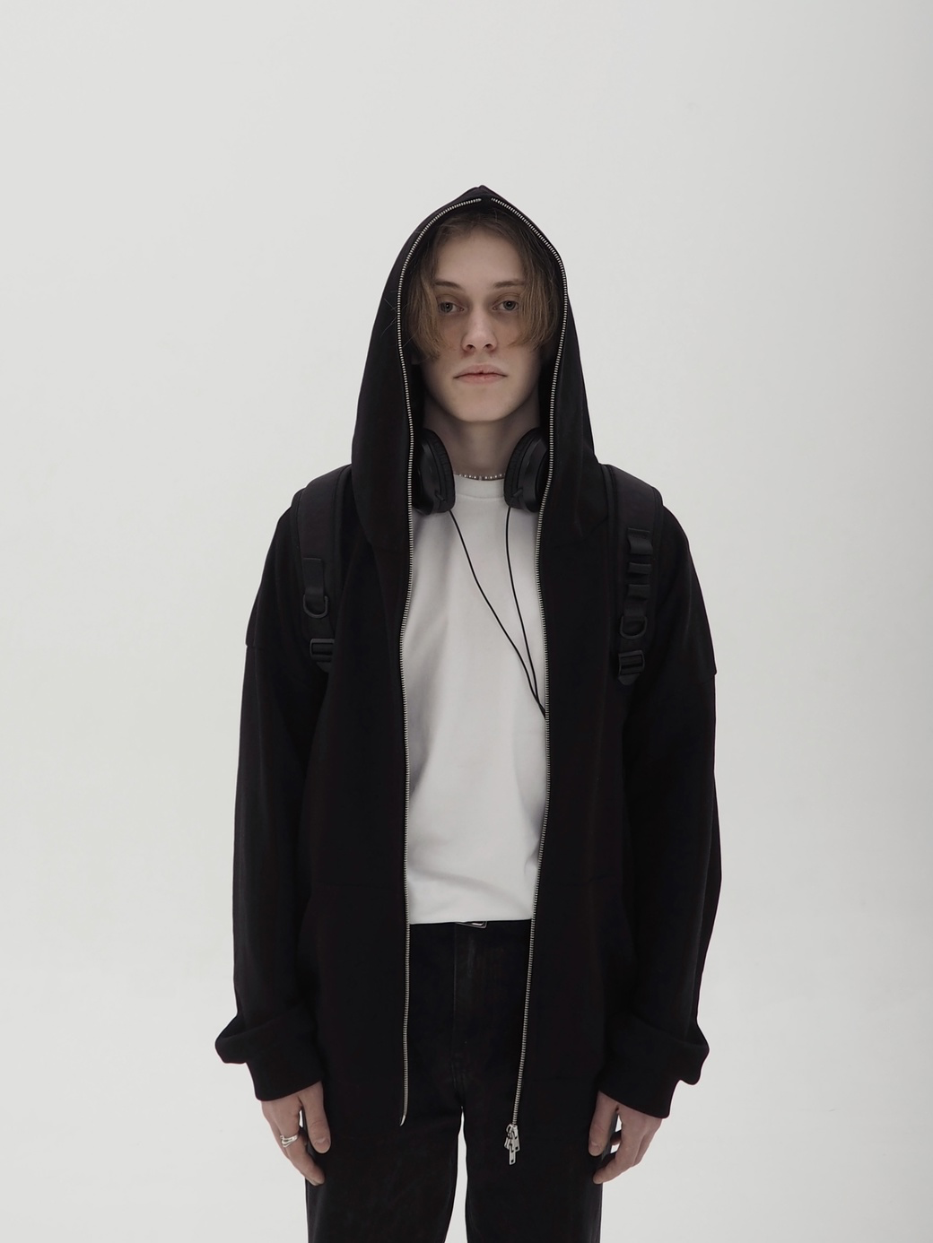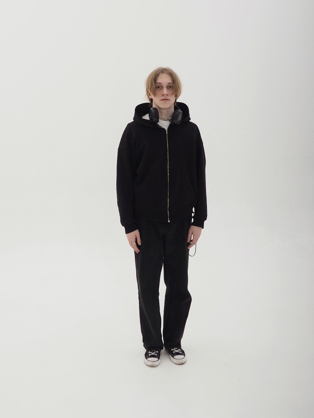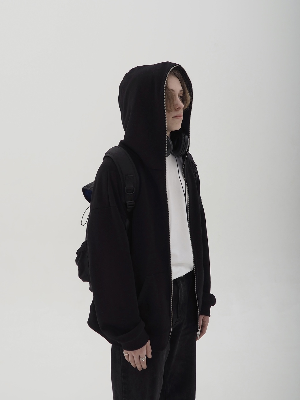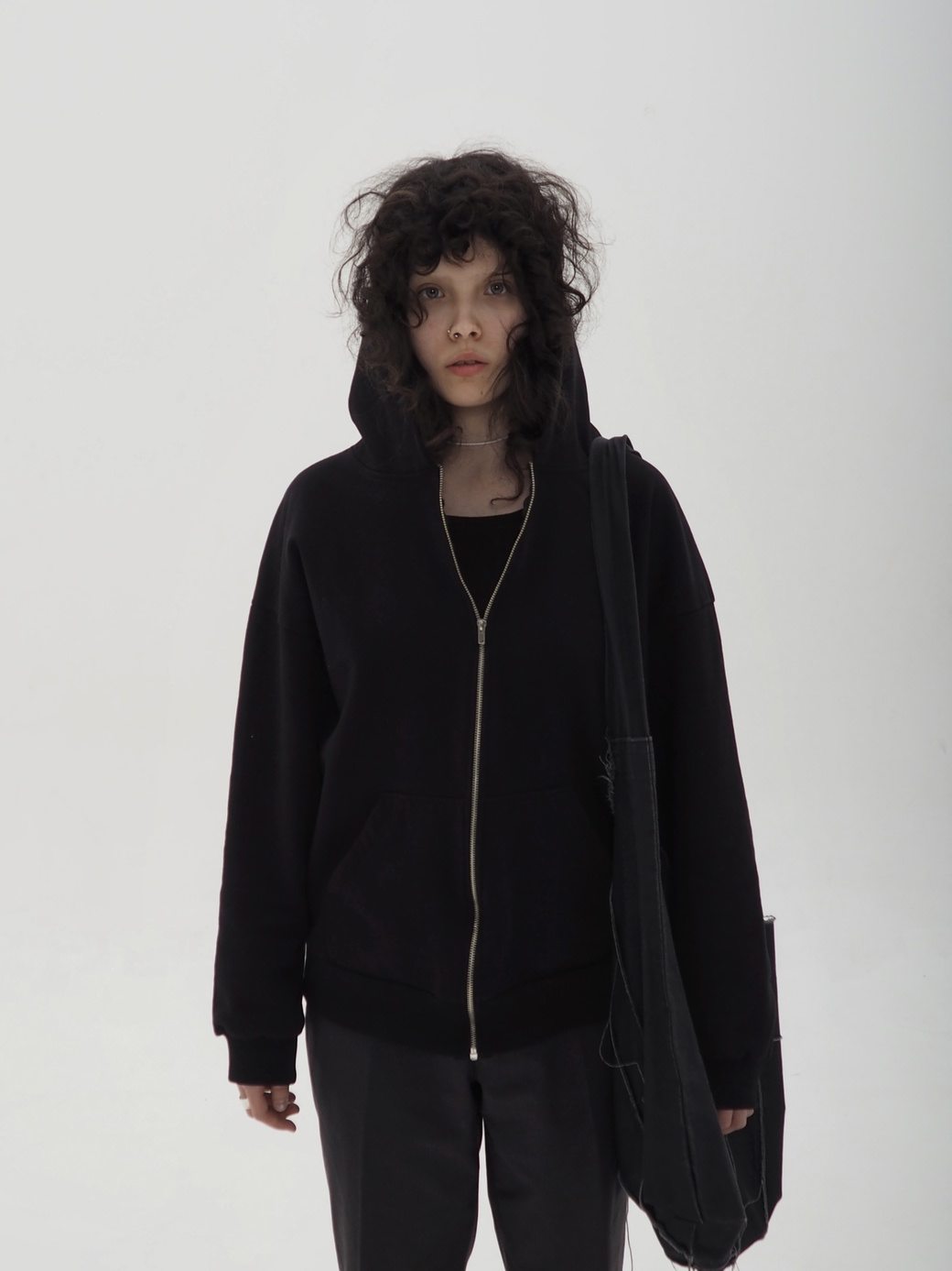 Унисекс-худи на молнии оверсайз-силуэта выполнено из плотного хлопкового футера. Главная особенность худи заключается в молнии, которая идет до конца капюшона, что дает возможность застегивать худи полностью. Также изделие имеет спущенную линию плеча, объемные рукава, карман спереди, капюшон, по низу рукавов и низу изделия - эластичные манжеты.