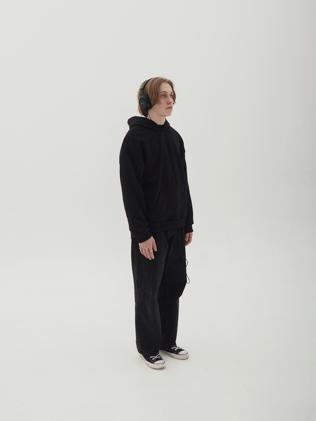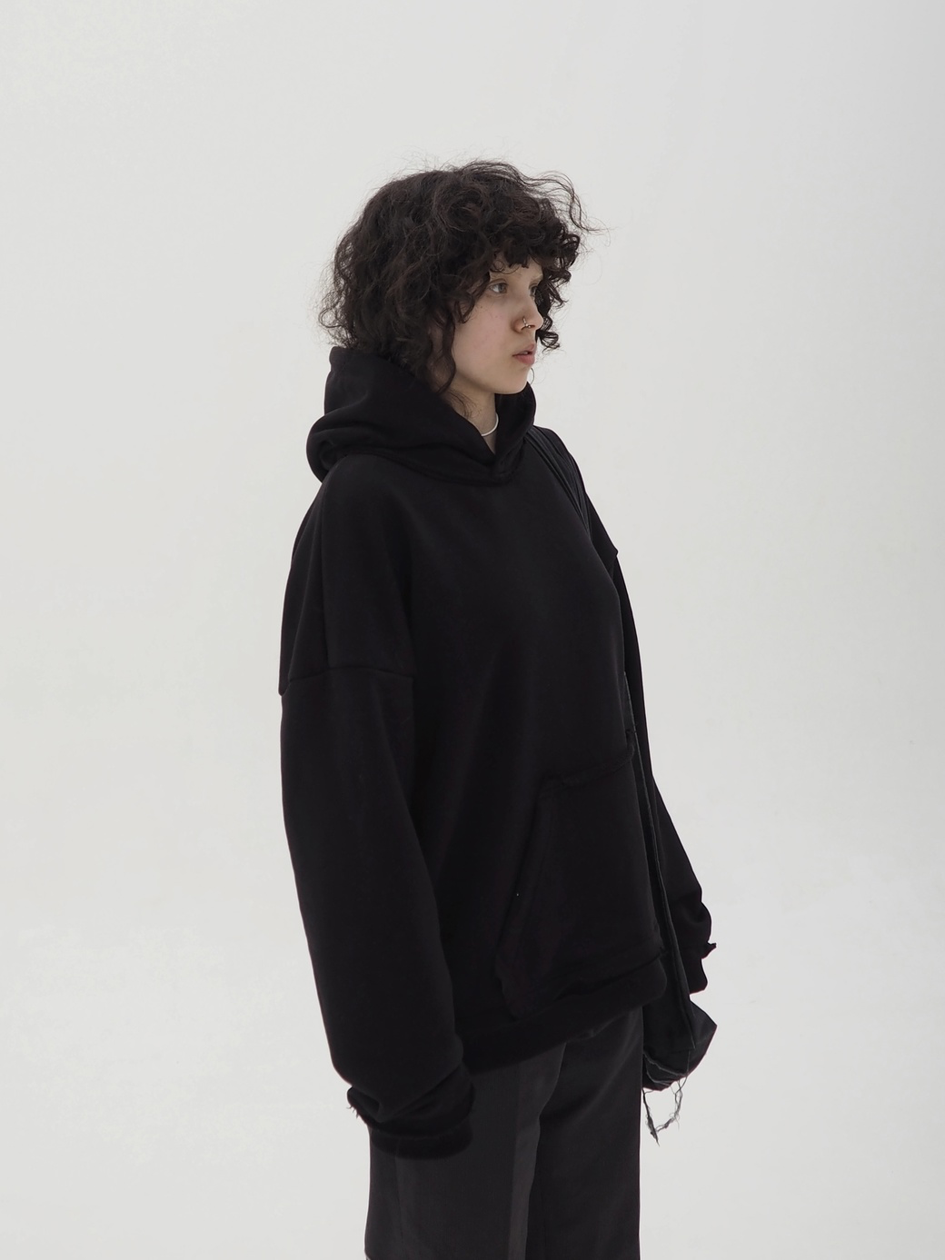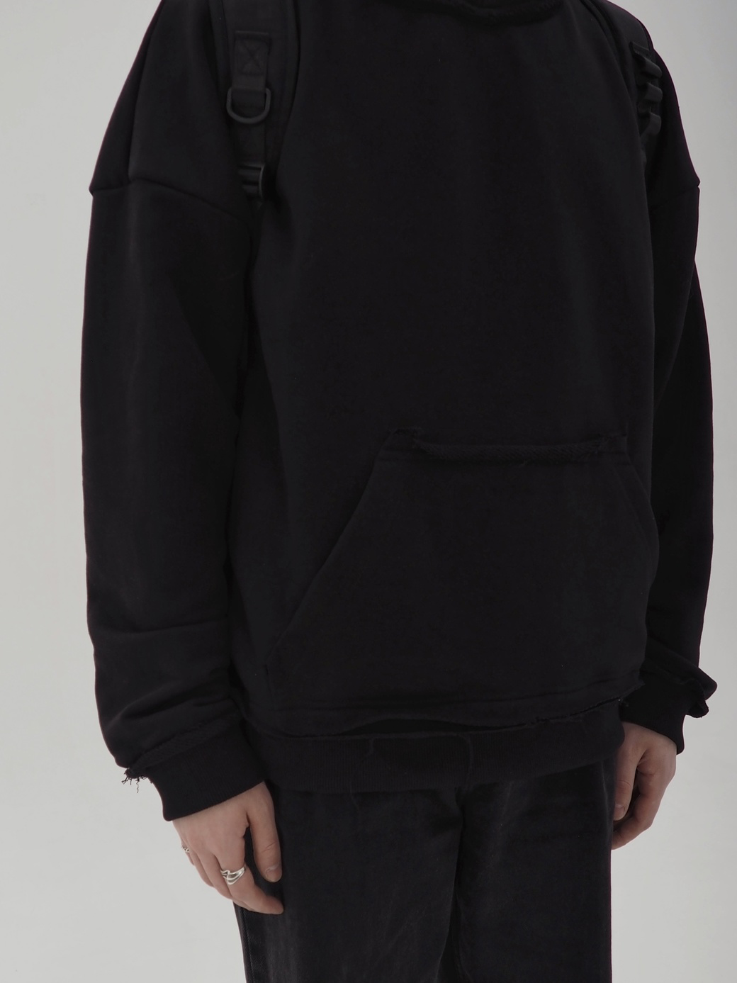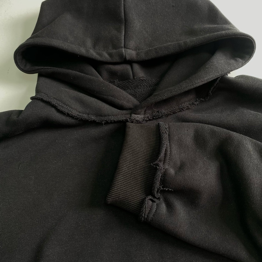 Унисекс-худи оверсайз-силуэта выполнен из плотного хлопкового футера. Швы на худи вывернуты наружу и имеют необработанные края. Также изделие имеет спущенную линию плеча, объемные рукава, карман спереди, капюшон, по низу рукавов и низу изделия - эластичные манжеты.