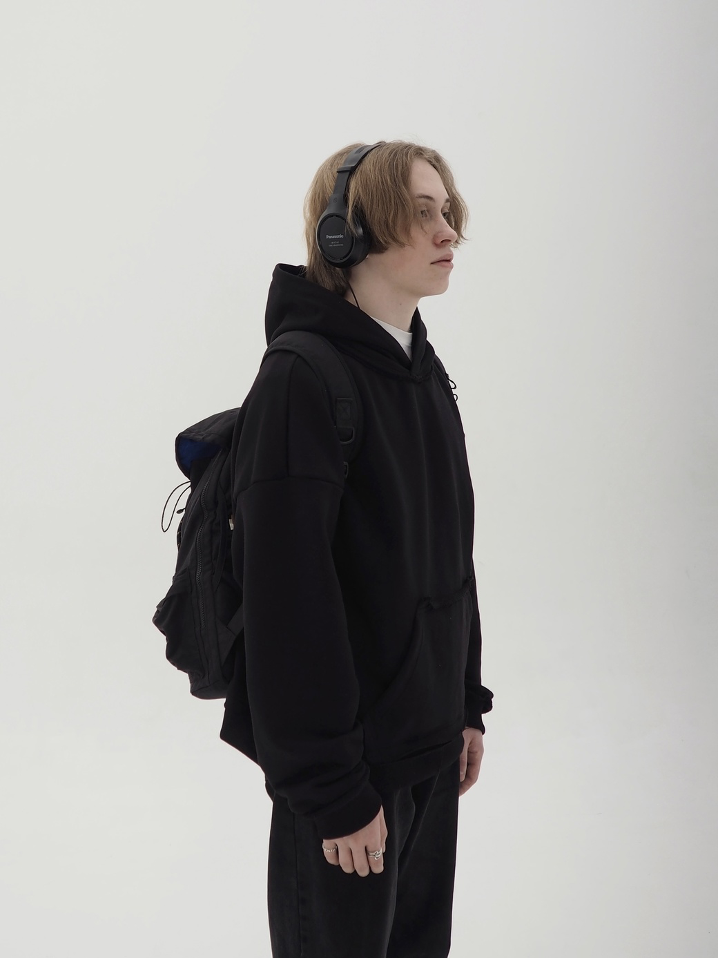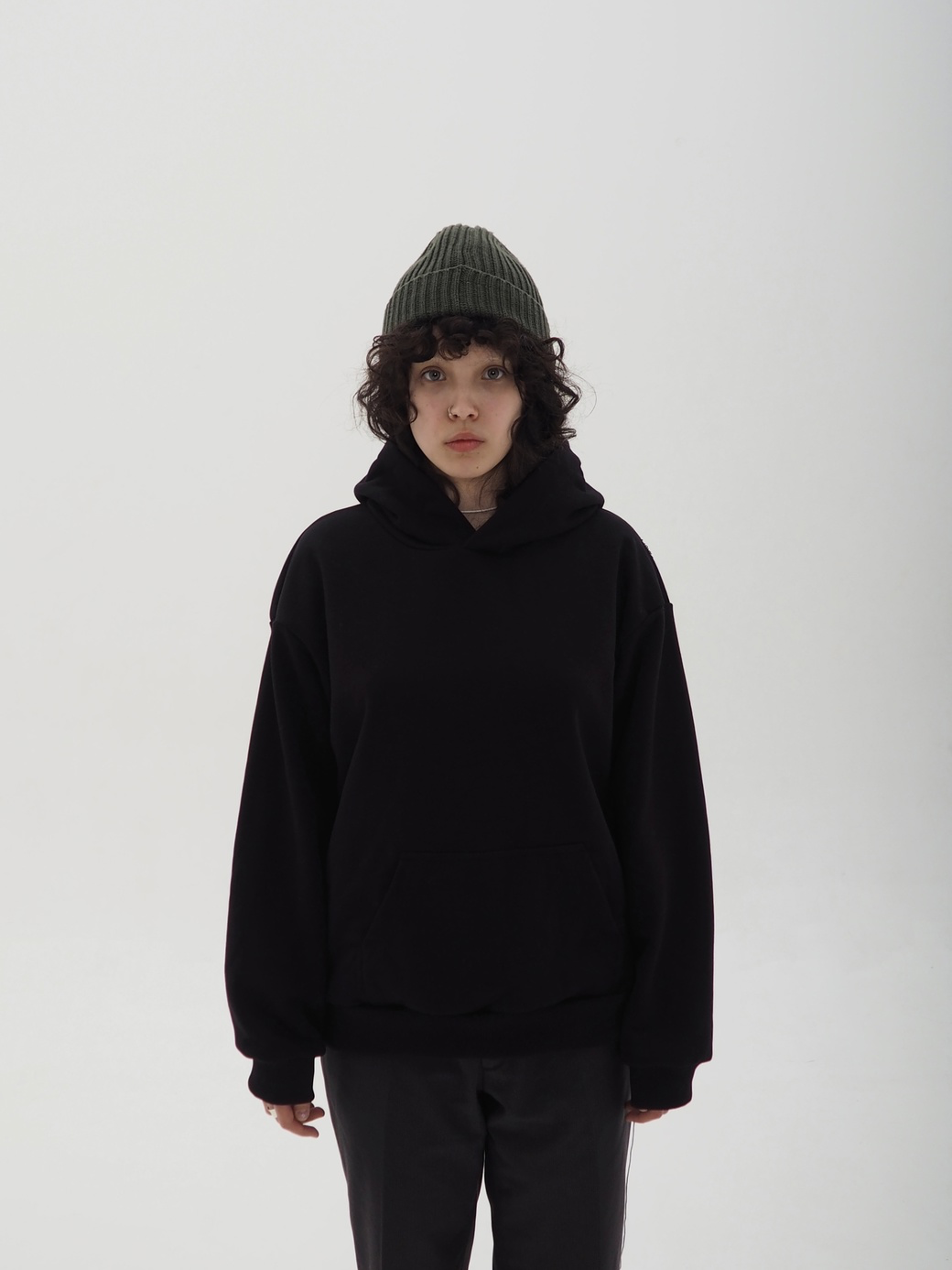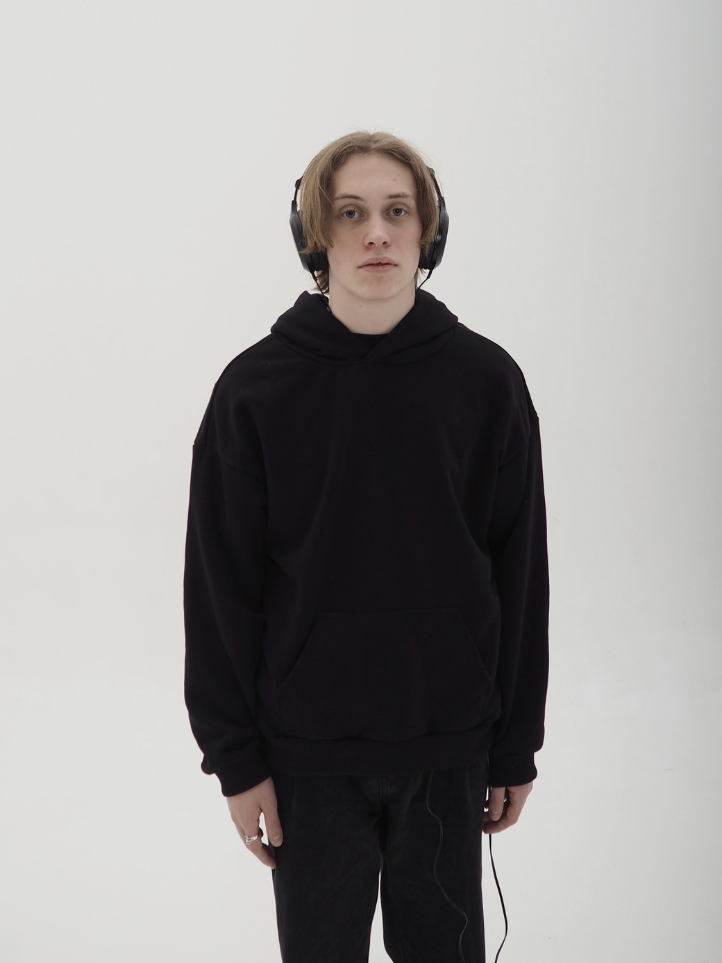 Унисекс-худи оверсайз-силуэта выполнен из плотного хлопкового футера. Швы на худи вывернуты наружу и имеют необработанные края. Также изделие имеет спущенную линию плеча, объемные рукава, карман спереди, капюшон, по низу рукавов и низу изделия - эластичные манжеты.